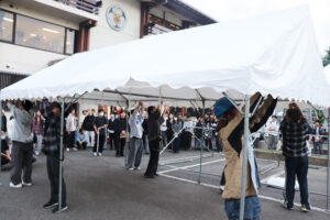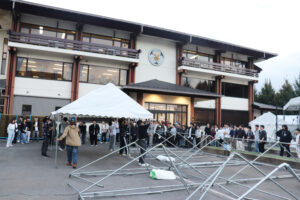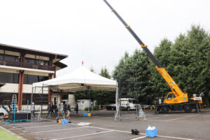 その後、明日のテント設営に備え、専門業者の方の指導の下でテントの立て方講習会を実施し、組み立て手順や固定方法、注意点などを学びました。