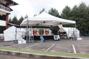 本日、秋桜祭に向けた野外特設ステージが組みあがりました。